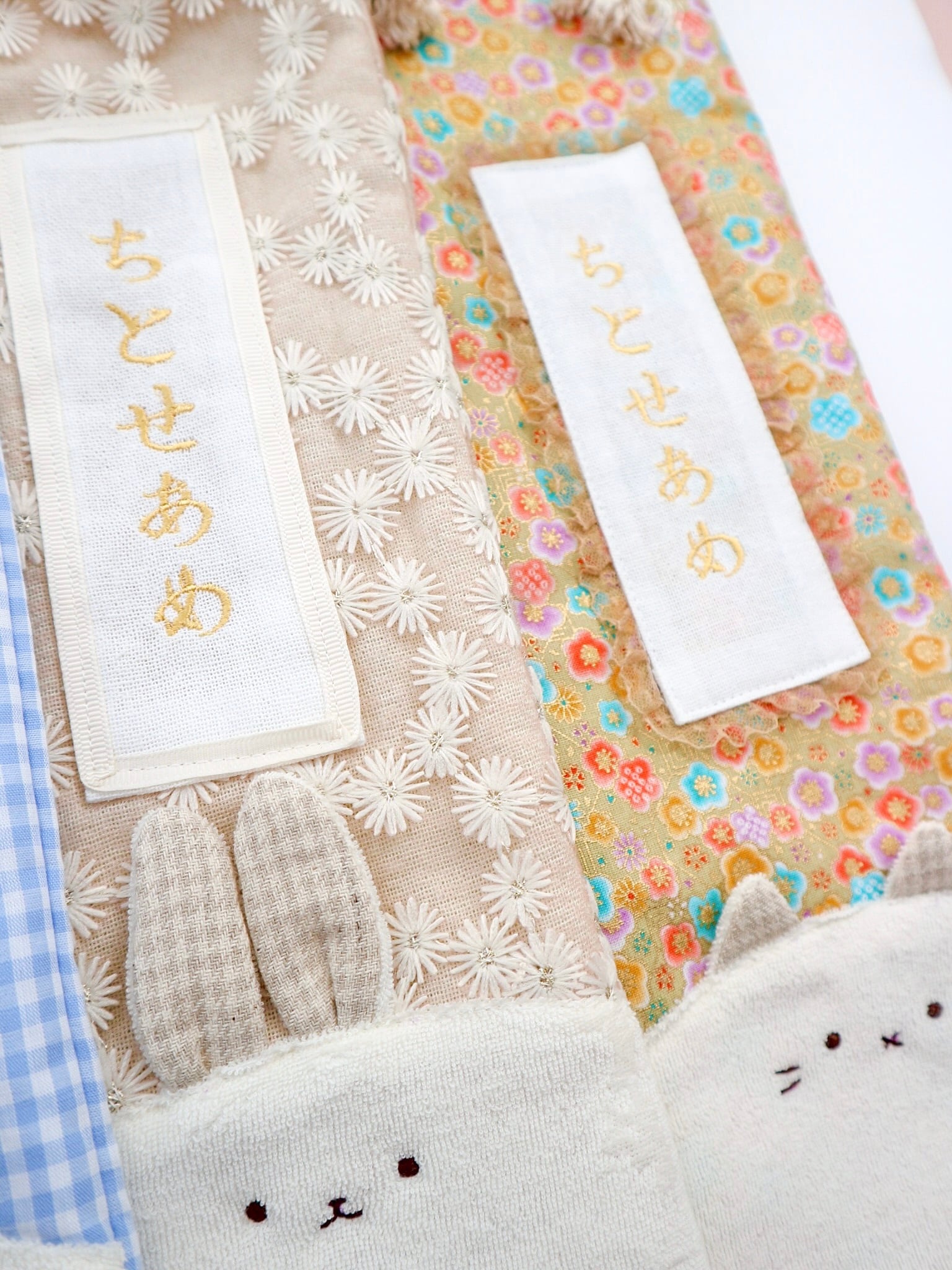 一つひとつ丁寧に仕立て、「ちとせあめ」「753」の文字はすべて刺繍で仕上げました。