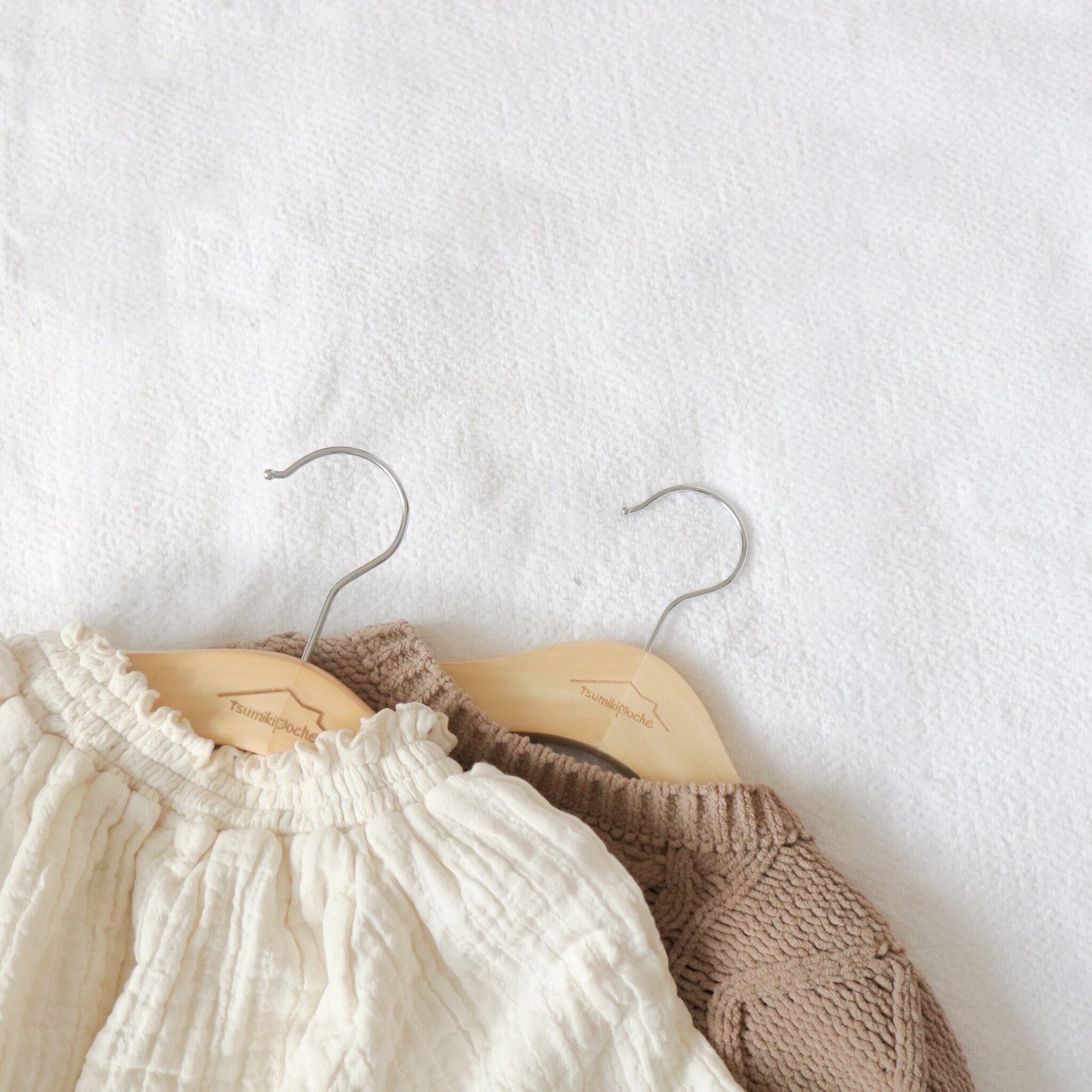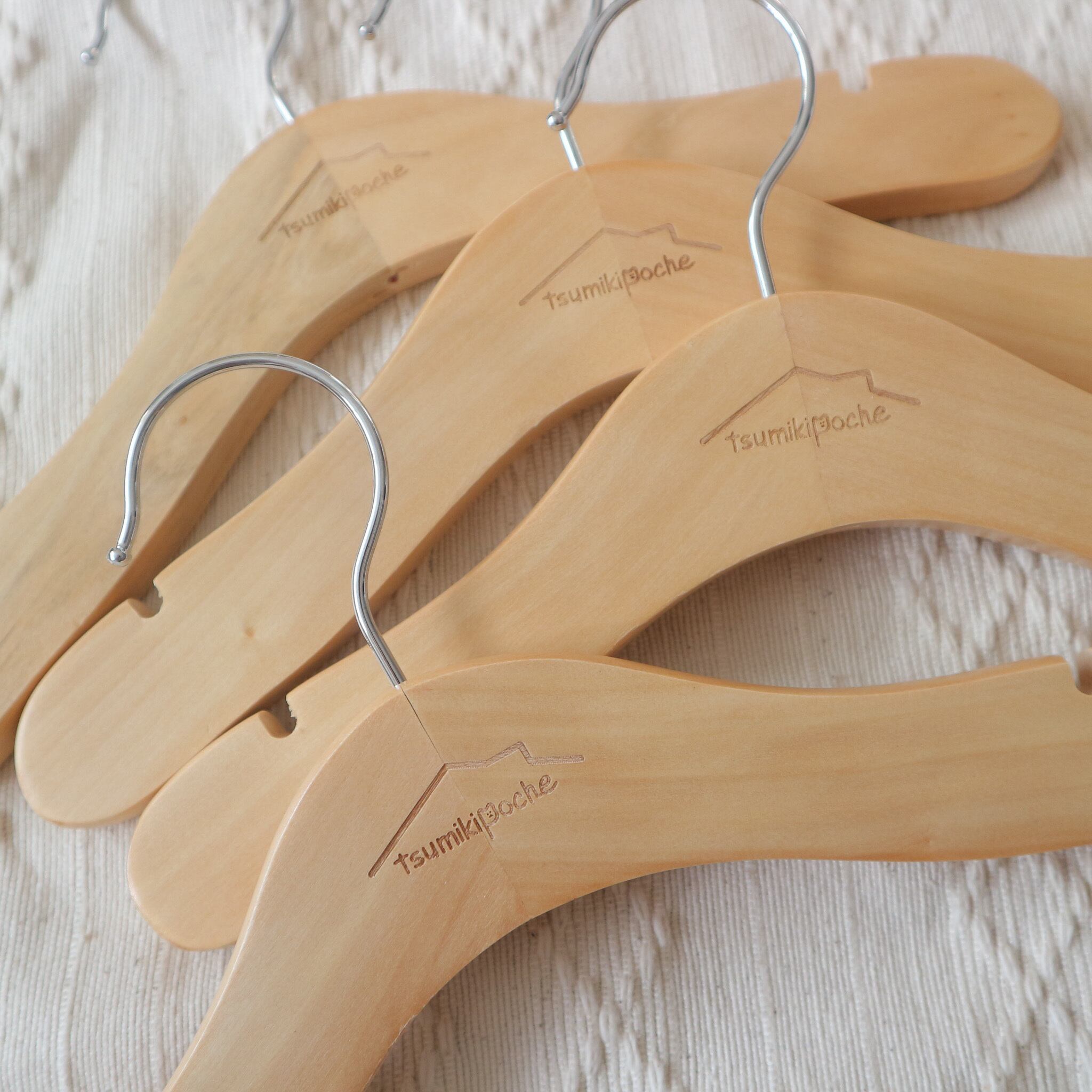 ツミキポッシュのロゴが入った木製のハンガーです。